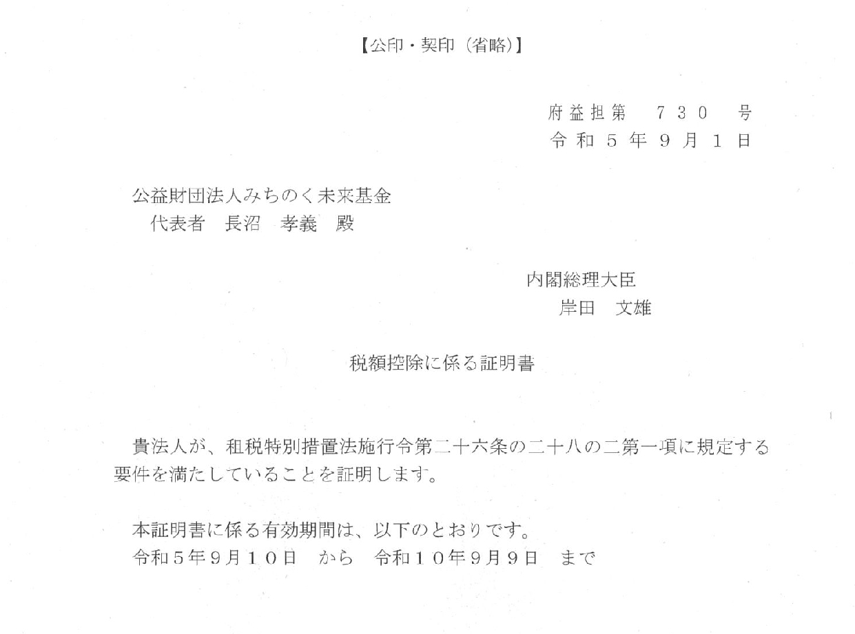 | なお、ご寄附の受付終了後も基金の季刊紙「みちのく未来通信」は発行を継続し、みちのく生の様子をお伝えいたします。これまでのご支援に重ねてお礼申し上げますとともに、今後ともみちのく生を温かく見守っていただければ幸いに存じます。 |