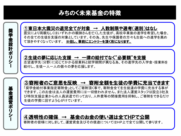 このような認識のもと、私達は震災によりご両親もしくは片親を亡くした彼らが夢を持ち続けながら成長していくサポートを中・長期的に行っていく事で、東北の地の復興を支援していこうと考えております。その中でも、サポートの少ない「大学及び専門教育への進学」に焦点を当て、この東北の地、ひいては日本の復興を支えていく人材を育成する事に寄与していきたく思います。